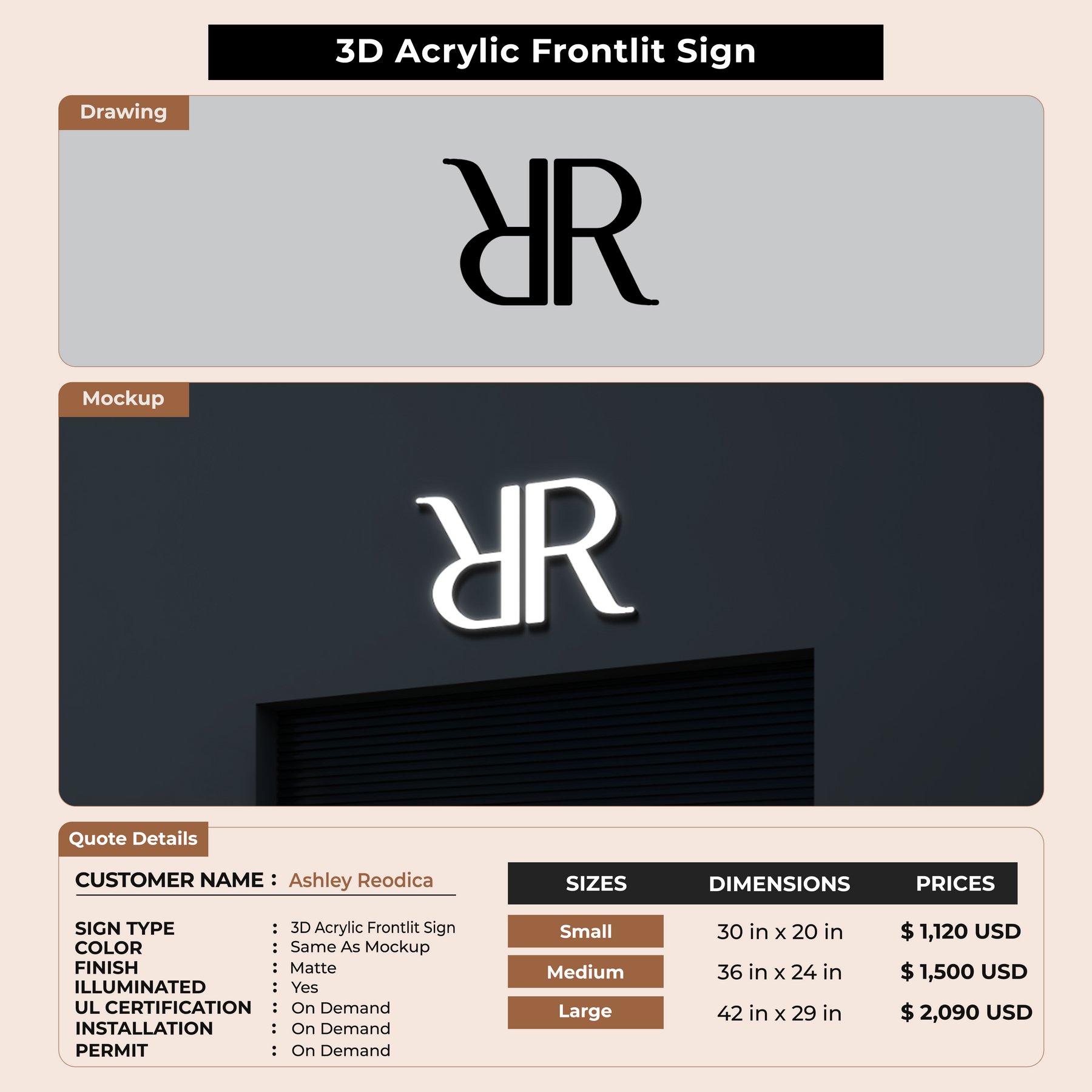 3D Acrylic Frontlit Sign for Ashley Reodica