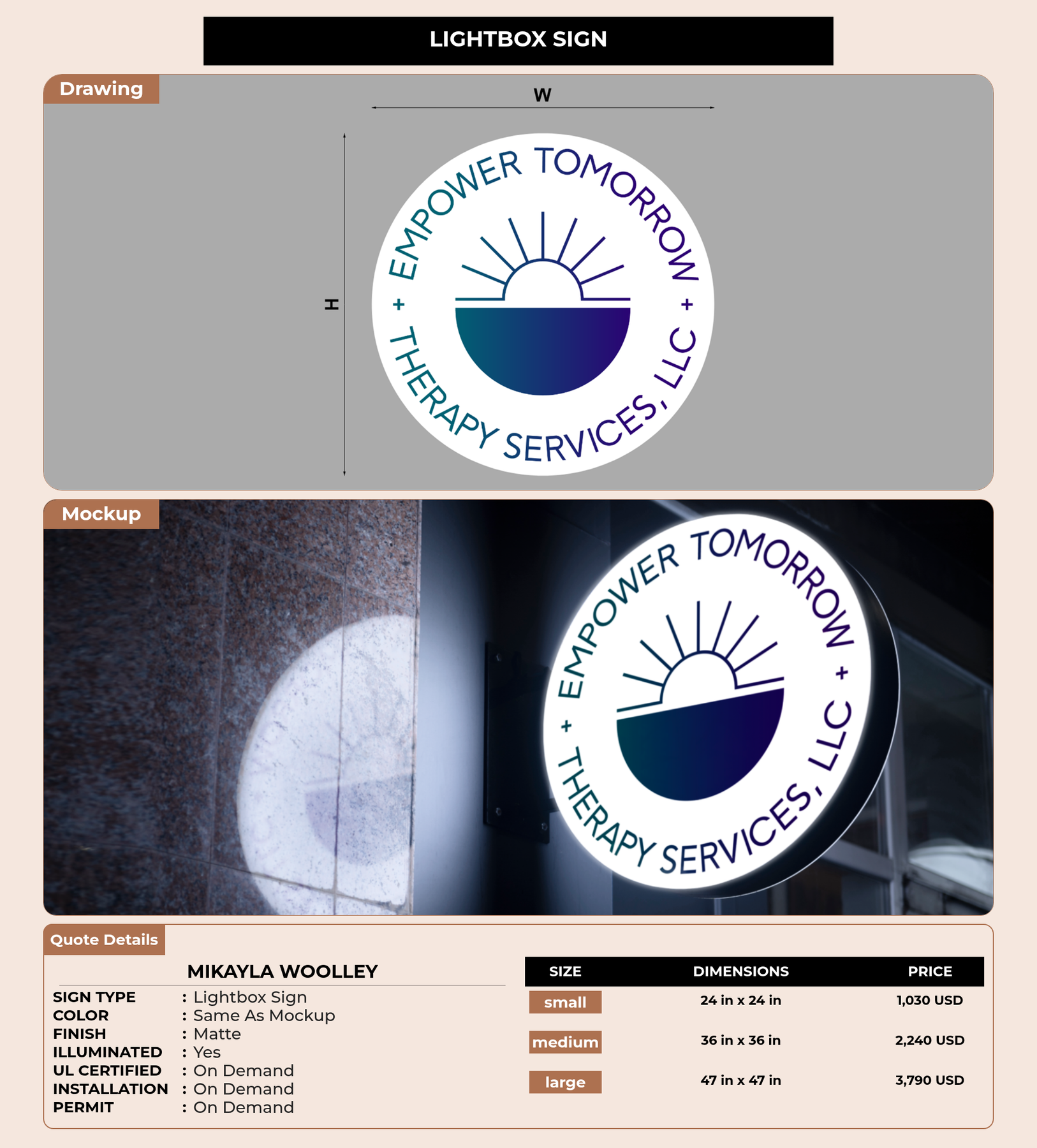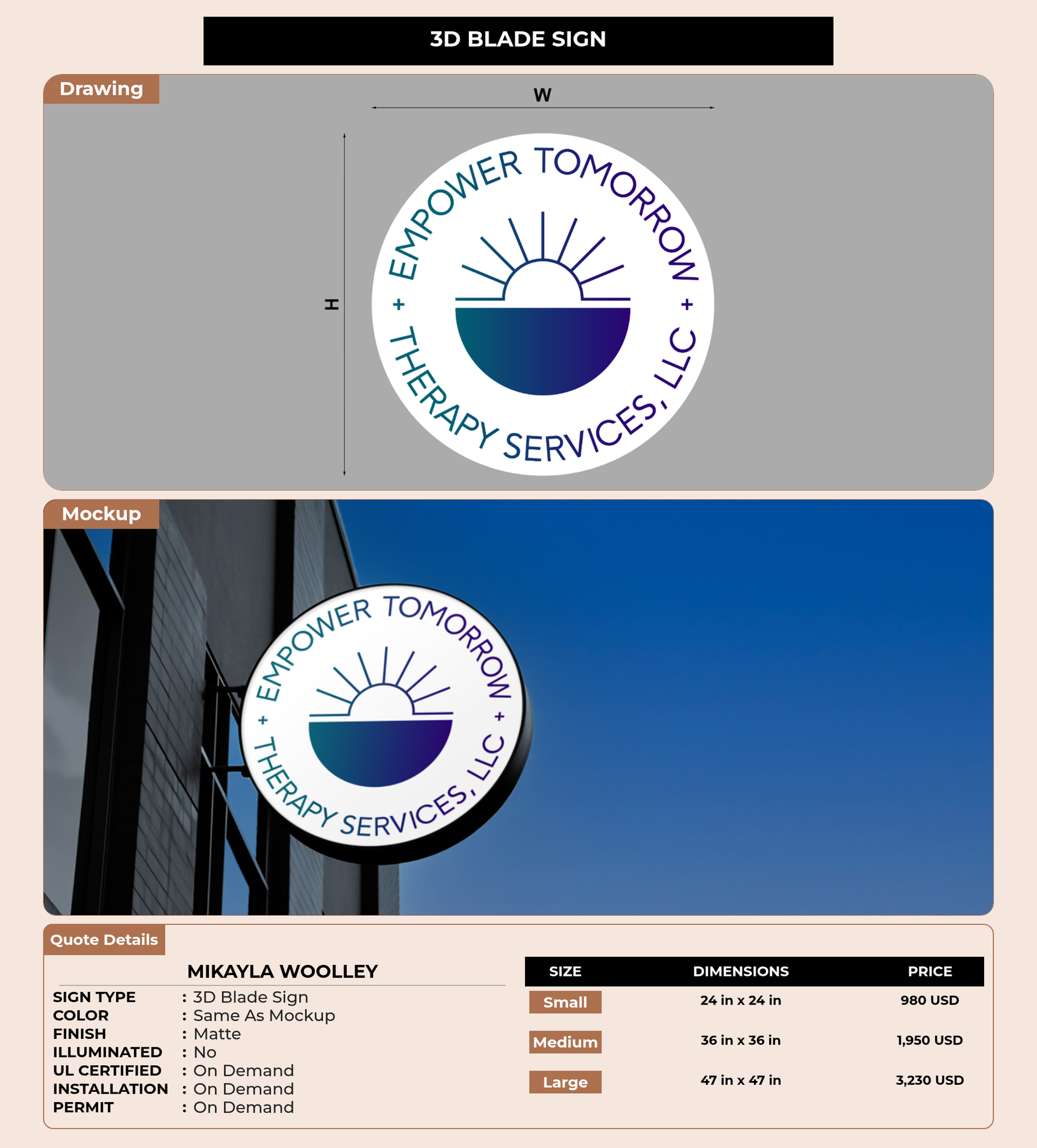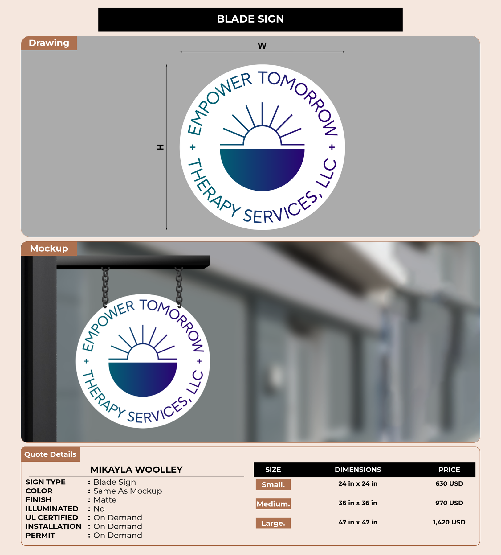 Enhance your business presence with our expertly crafted signage, made from top-quality material, to ensure longevity and durability. Fully customizable to reflect your unique brand identity, our signage offers a professional and polished appearance. Easy to install and low maintenance, it’s the perfect addition to any business setting. Trust us to deliver a product that not only meets but exceeds your expectations.