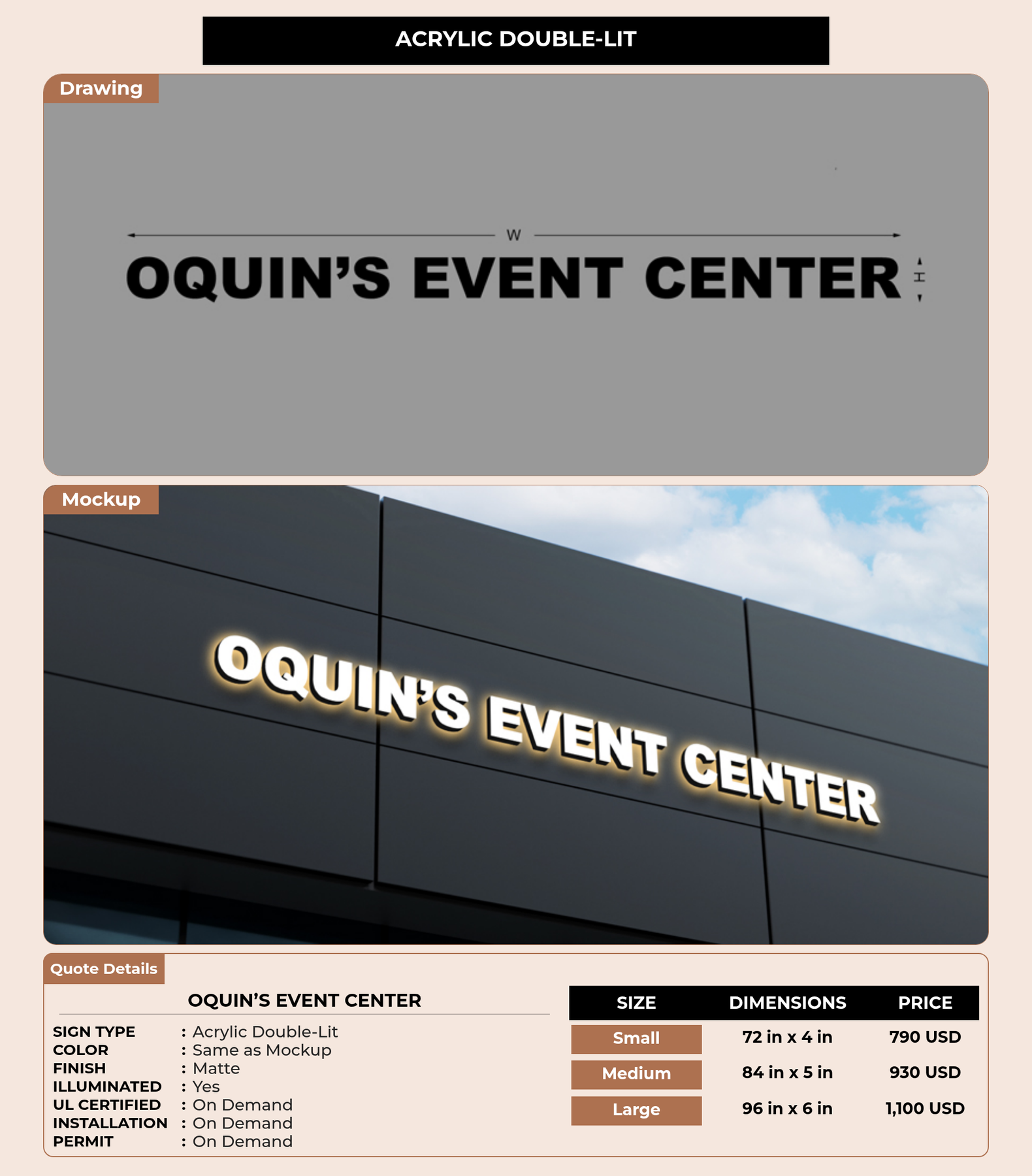 CUSTOM MOCKUP SIGN FOR OQUIN’S EVENT CENTER