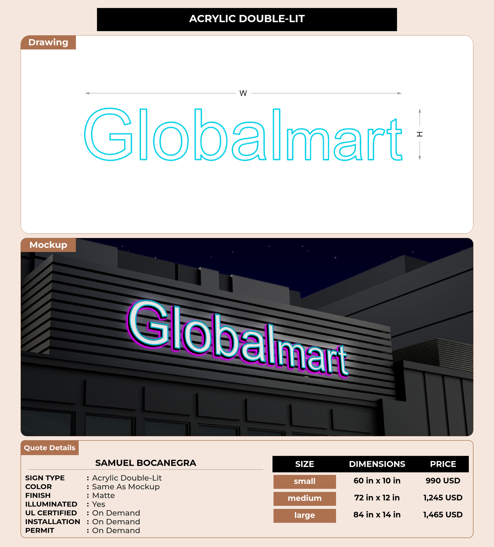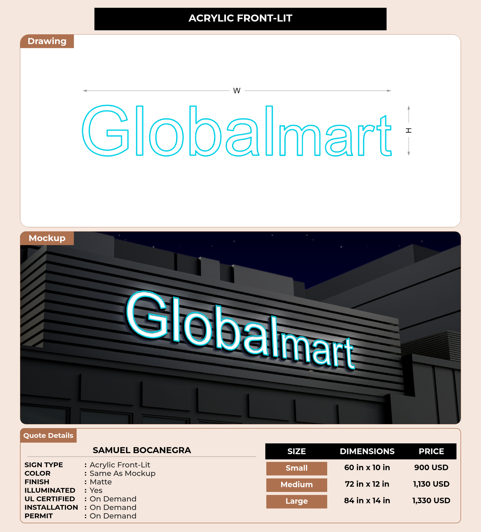 Eye-catching custom 3D sign for Samuel Bocanegra