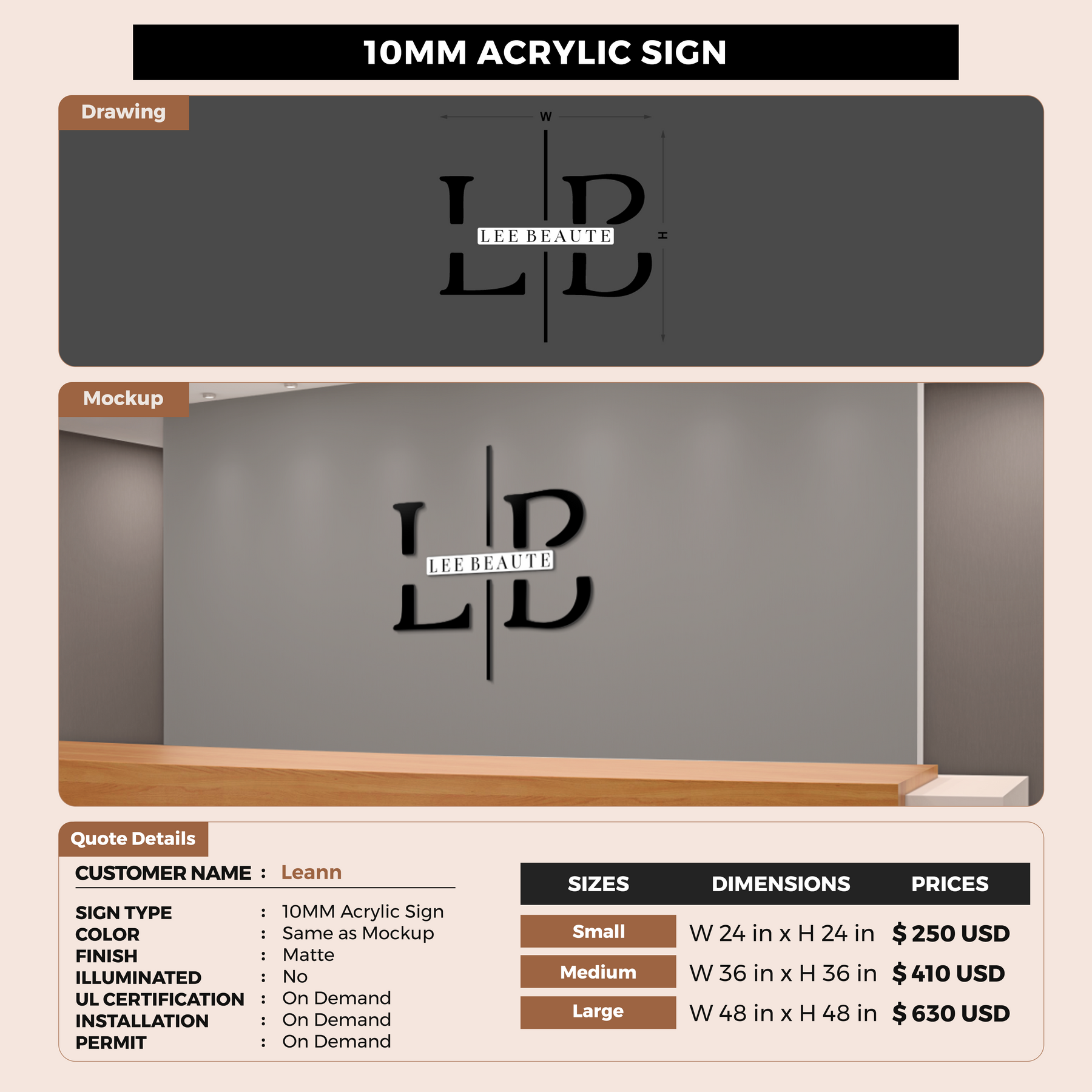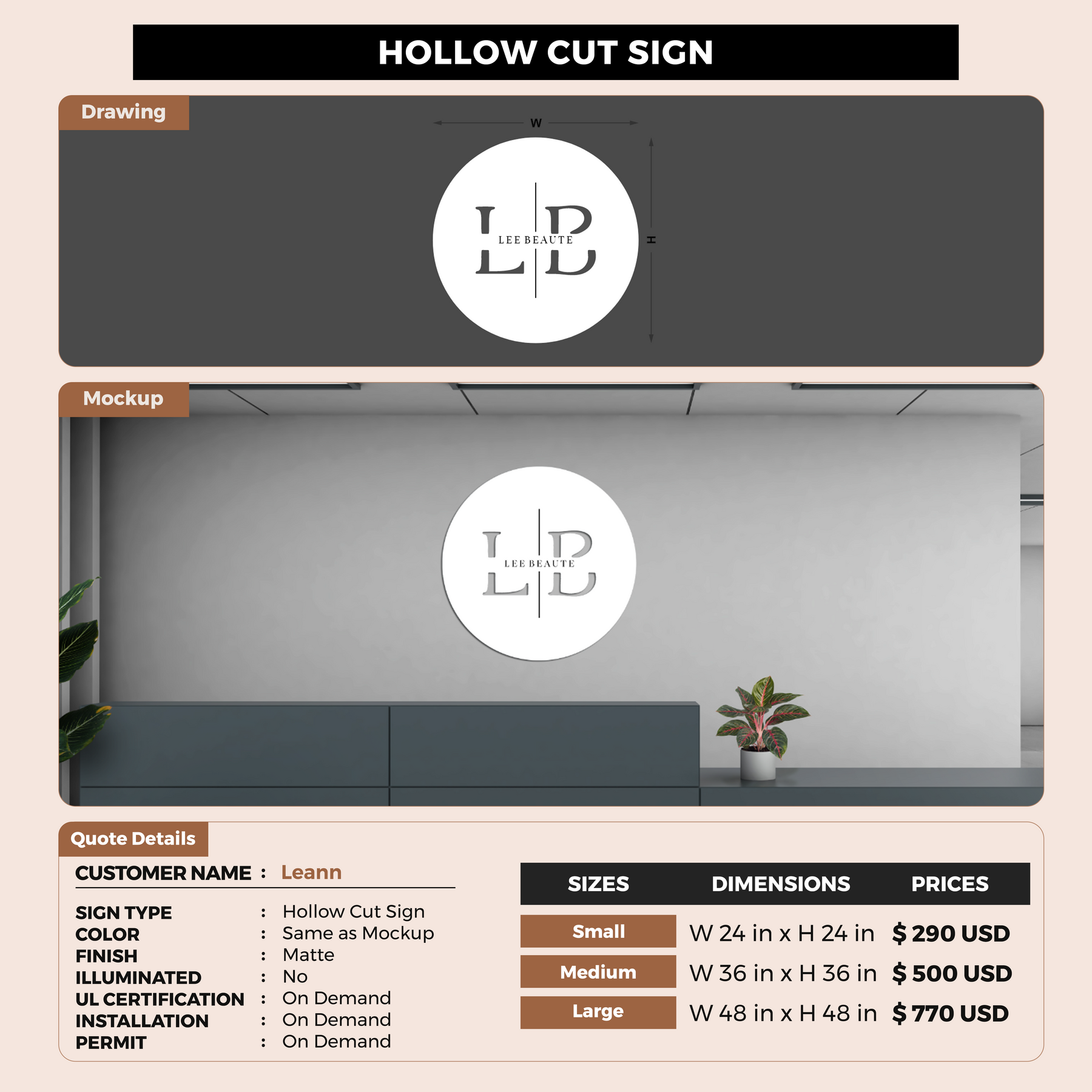 Crafted with premium material, this signage will elevate your business image, precisely mirroring your logo for a professional look.